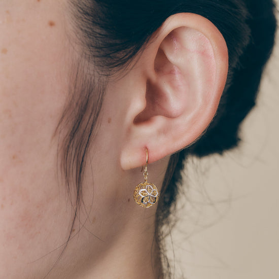 可愛らしいボール型に繊細なアンティーク柄が耳元で揺れ動くのが特徴です