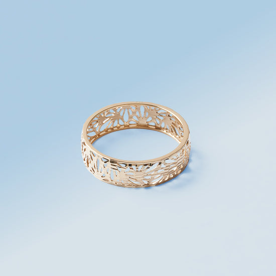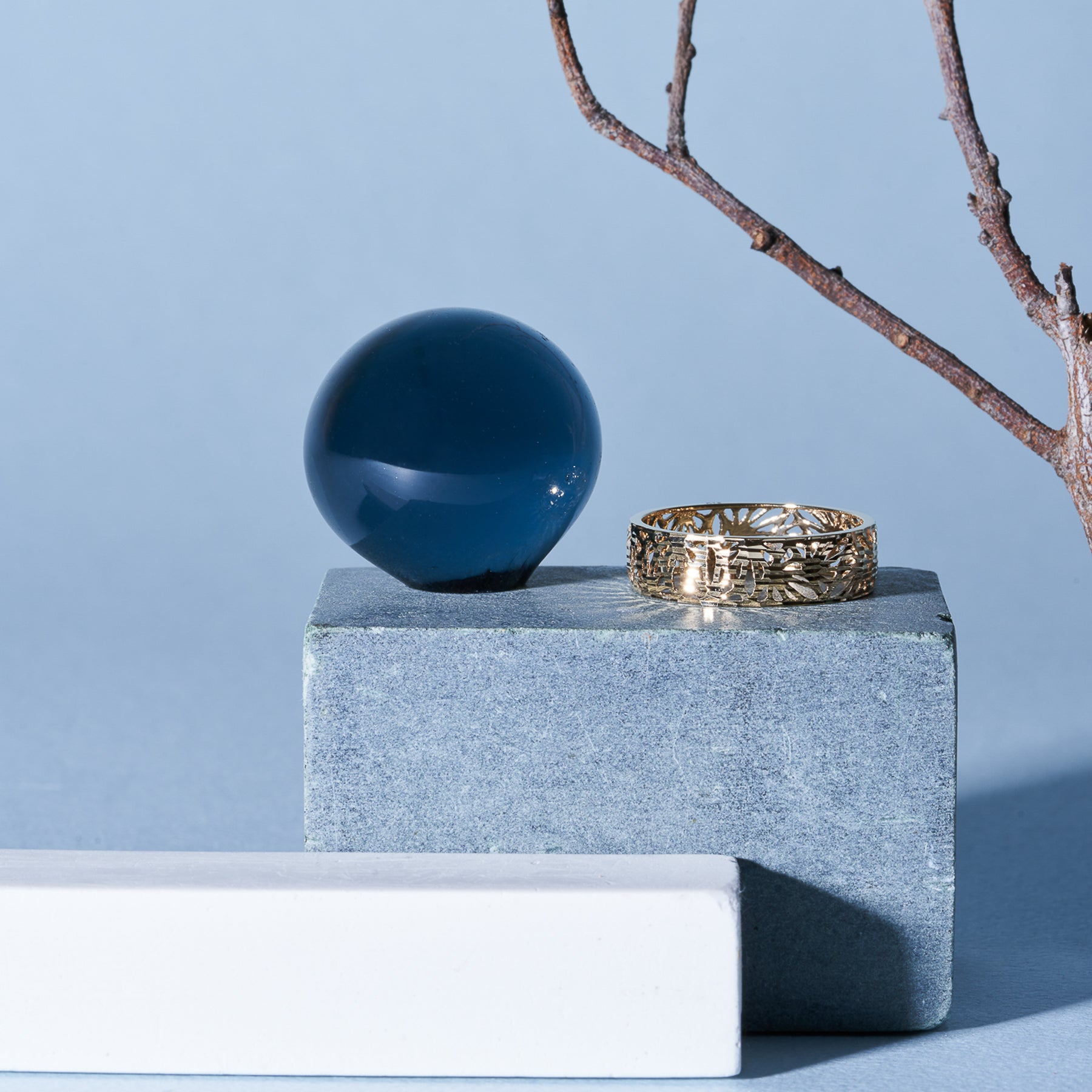 繊細な透かしデザインで、表面はやや艶消しのカット加工、角度によって輝くように仕上げました